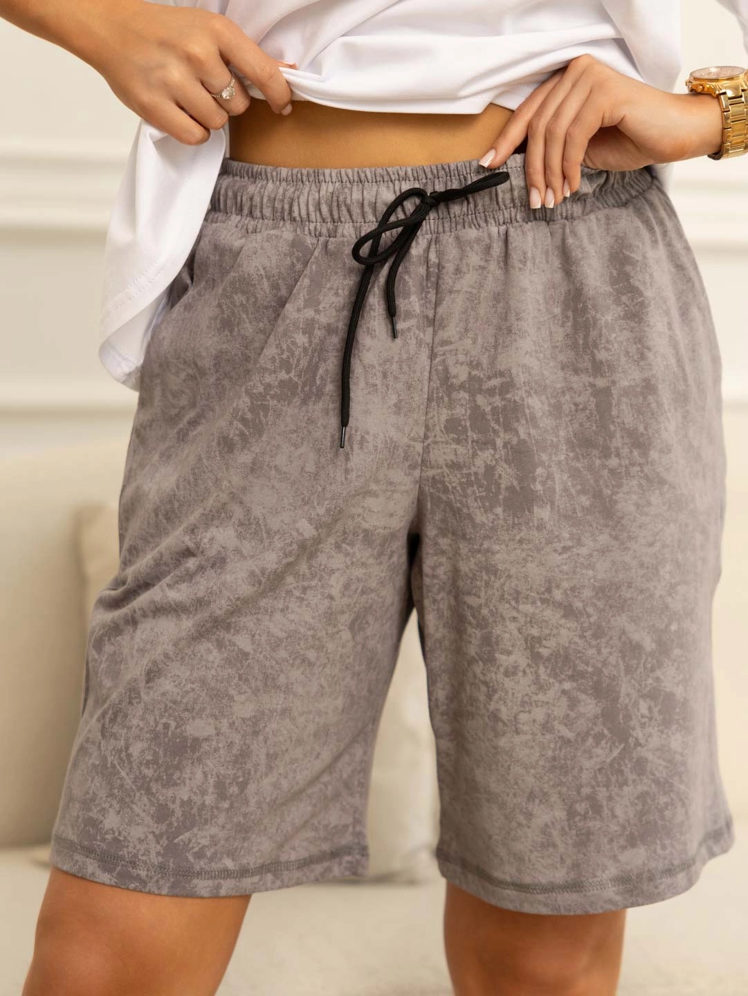 Шорты женские из мягкого, приятного к телу трикотажного материала, длиной выше колена. Пояс на резинке, для надежной и удобной посадки, дополнительно укомплектован шнуровкой. В боковых швах глубокие карманы. Уникальный дизайн, в стиле - варенка. Отличный вариант для активного отдыха, велопрогулок и спортивных мероприятий.