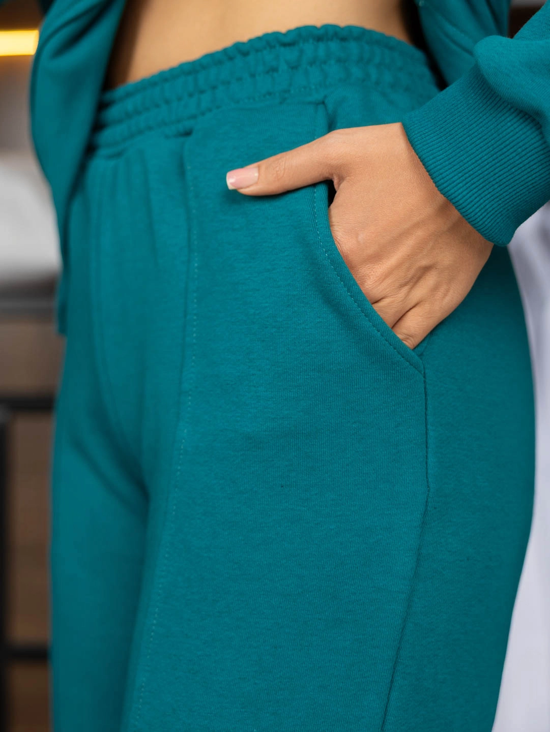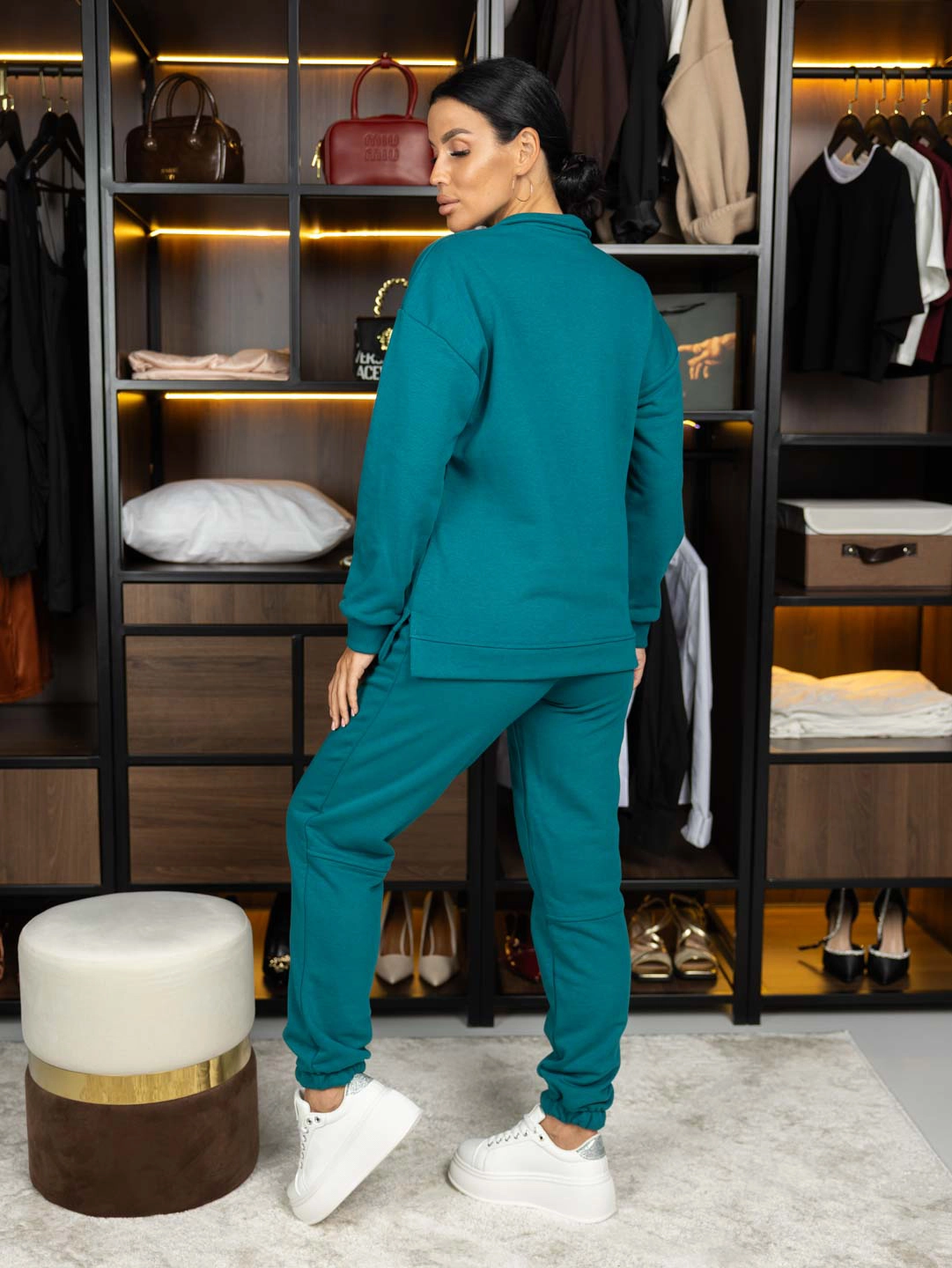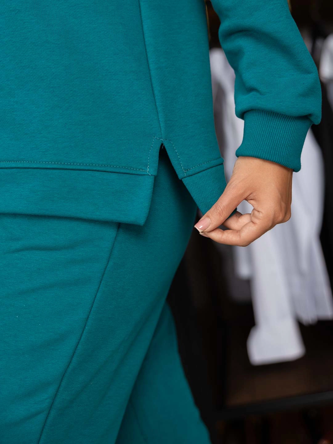 Костюм женский из качественного футера. Толстовка немного удлиненная, с воротником типа стойка и застежкой на молнию, а так же стильным принтом на груди. В нижней части боковой вырез, для максимального комфорта и свободы движения. Брюки  - прямые, на манжетах, с карманами. Пояс на резинке, для надежной фиксации. Стильный, легкий вариант на каждый день.