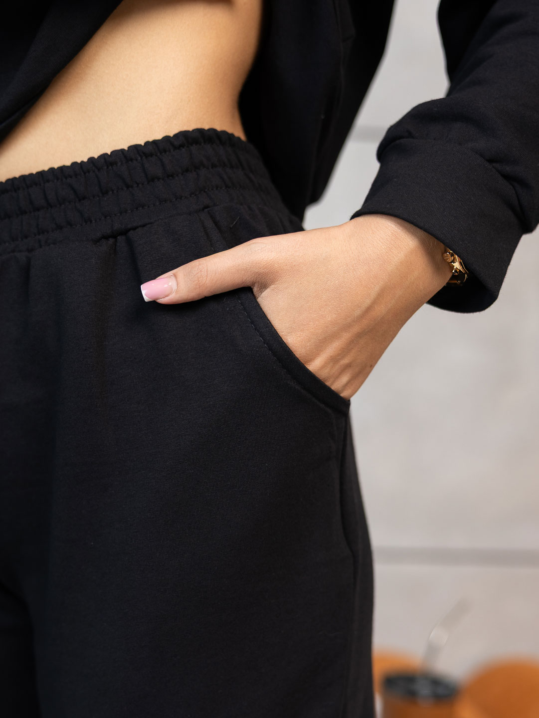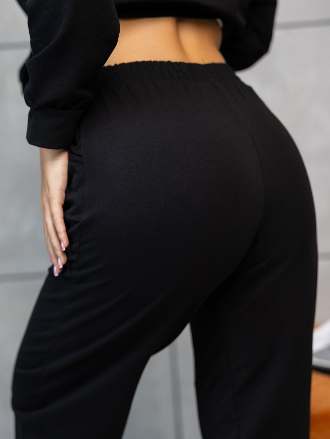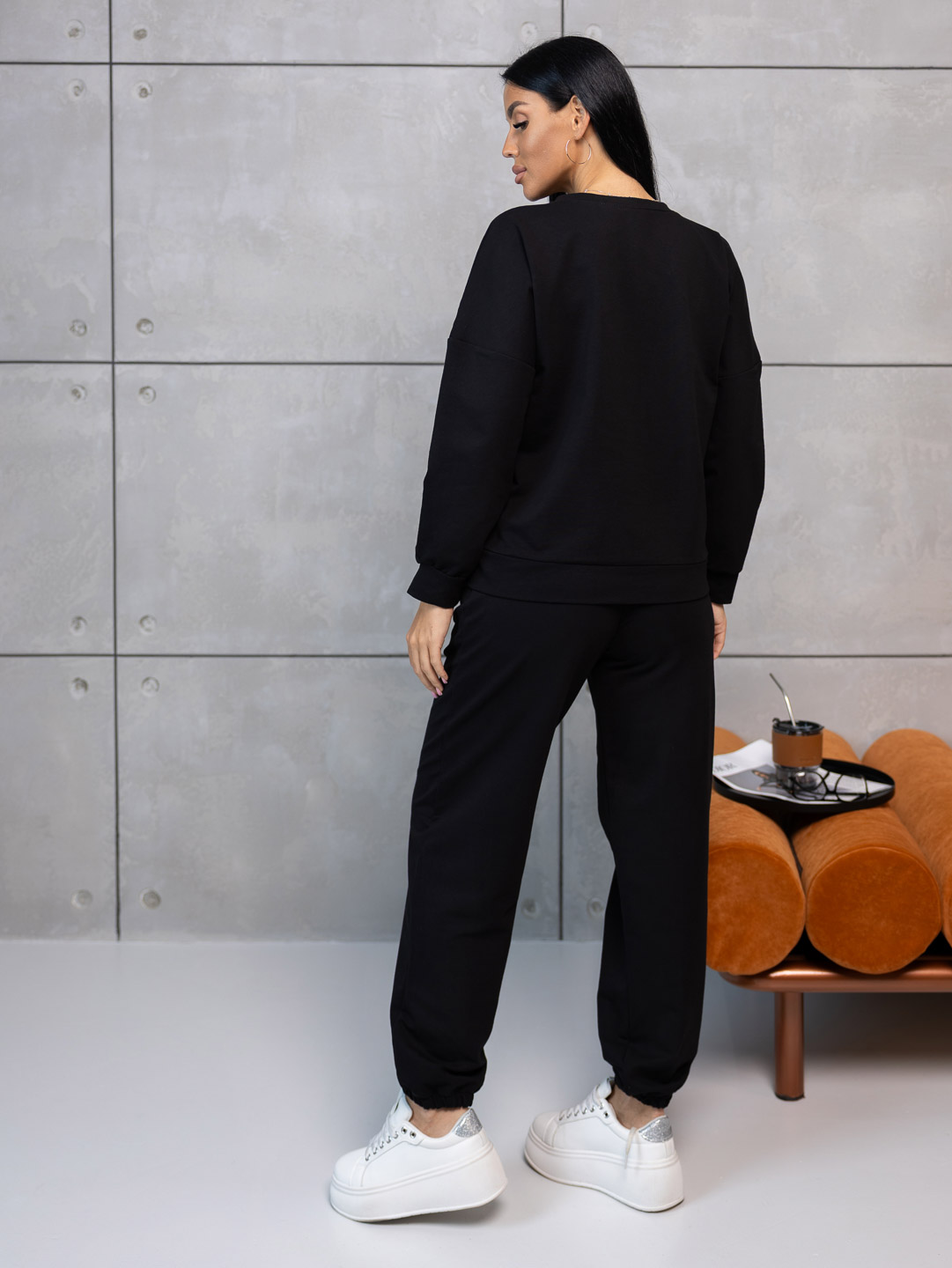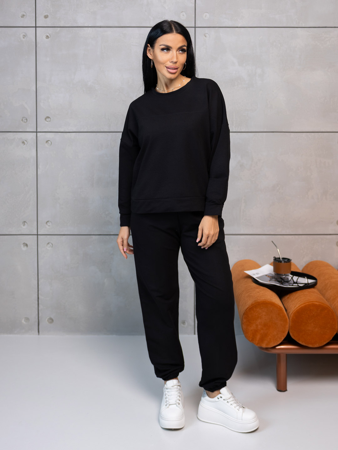 Неотразимый и стильный черный женский костюм из мягкого футера - идеальный выбор для повседневного образа с характером. Эффектно подчеркивающий фигуру и при этом комфортный в носке, этот костюм станет незаменимой частью гардероба каждой модницы. Создайте выразительный образ с помощью этого элегантного комплекта!