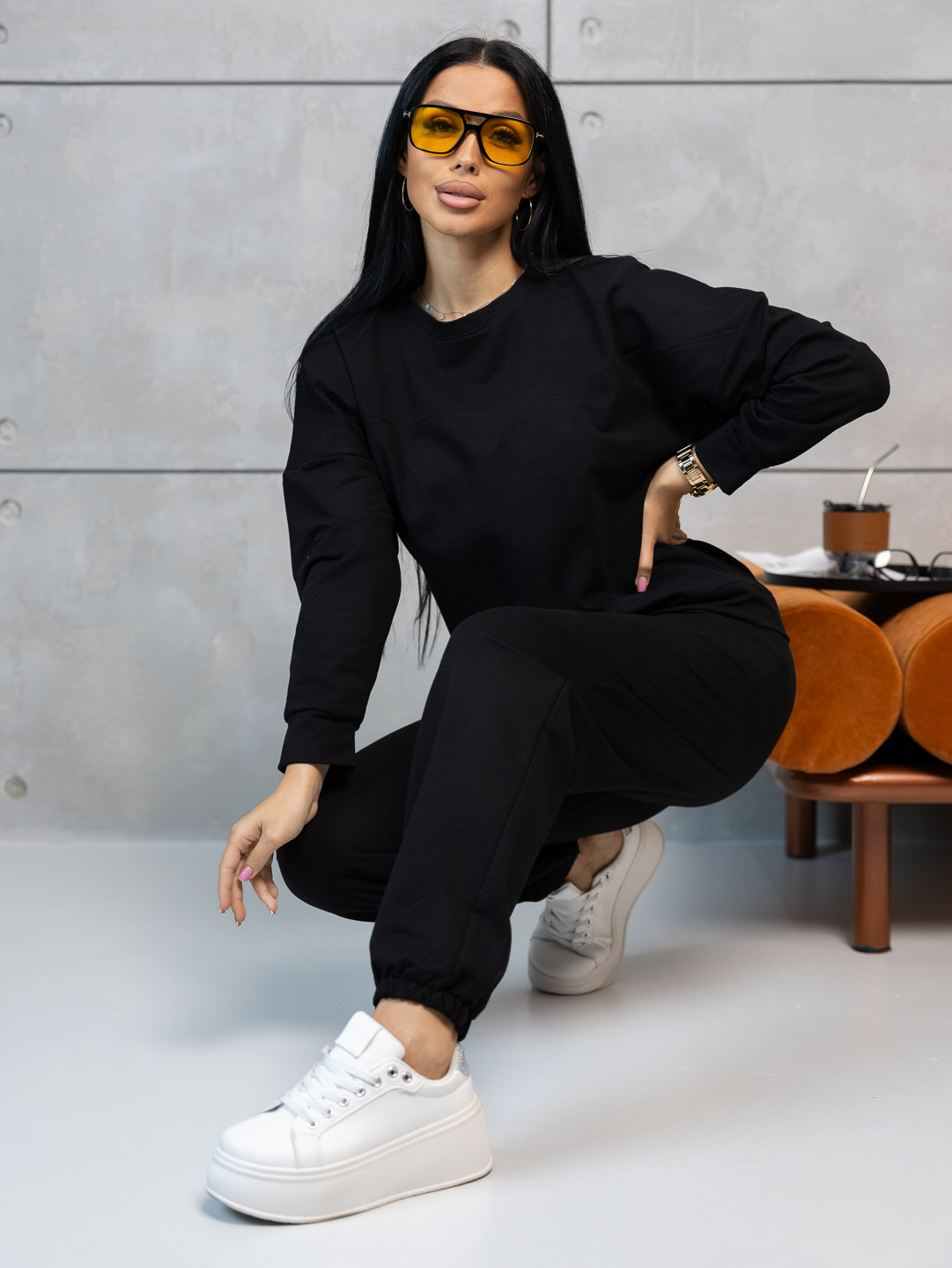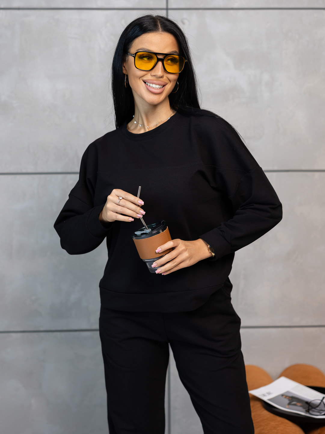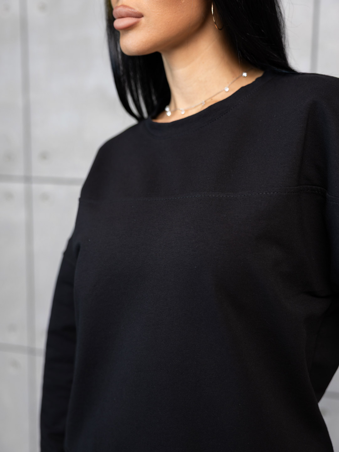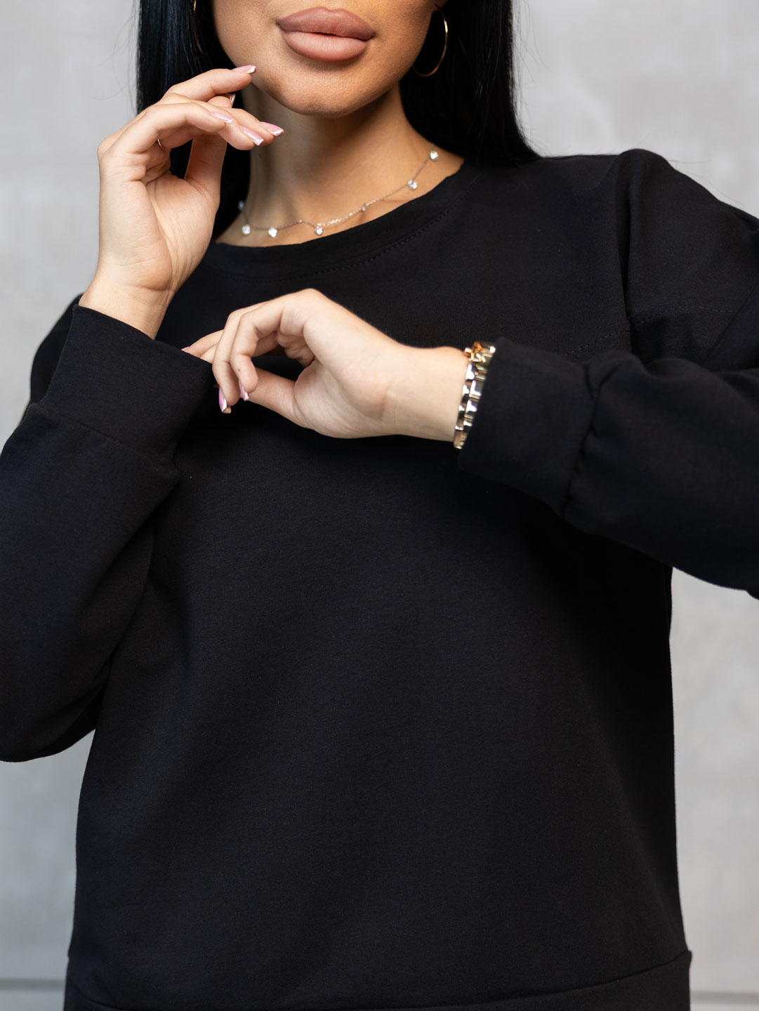 Неотразимый и стильный черный женский костюм из мягкого футера - идеальный выбор для повседневного образа с характером. Эффектно подчеркивающий фигуру и при этом комфортный в носке, этот костюм станет незаменимой частью гардероба каждой модницы. Создайте выразительный образ с помощью этого элегантного комплекта!