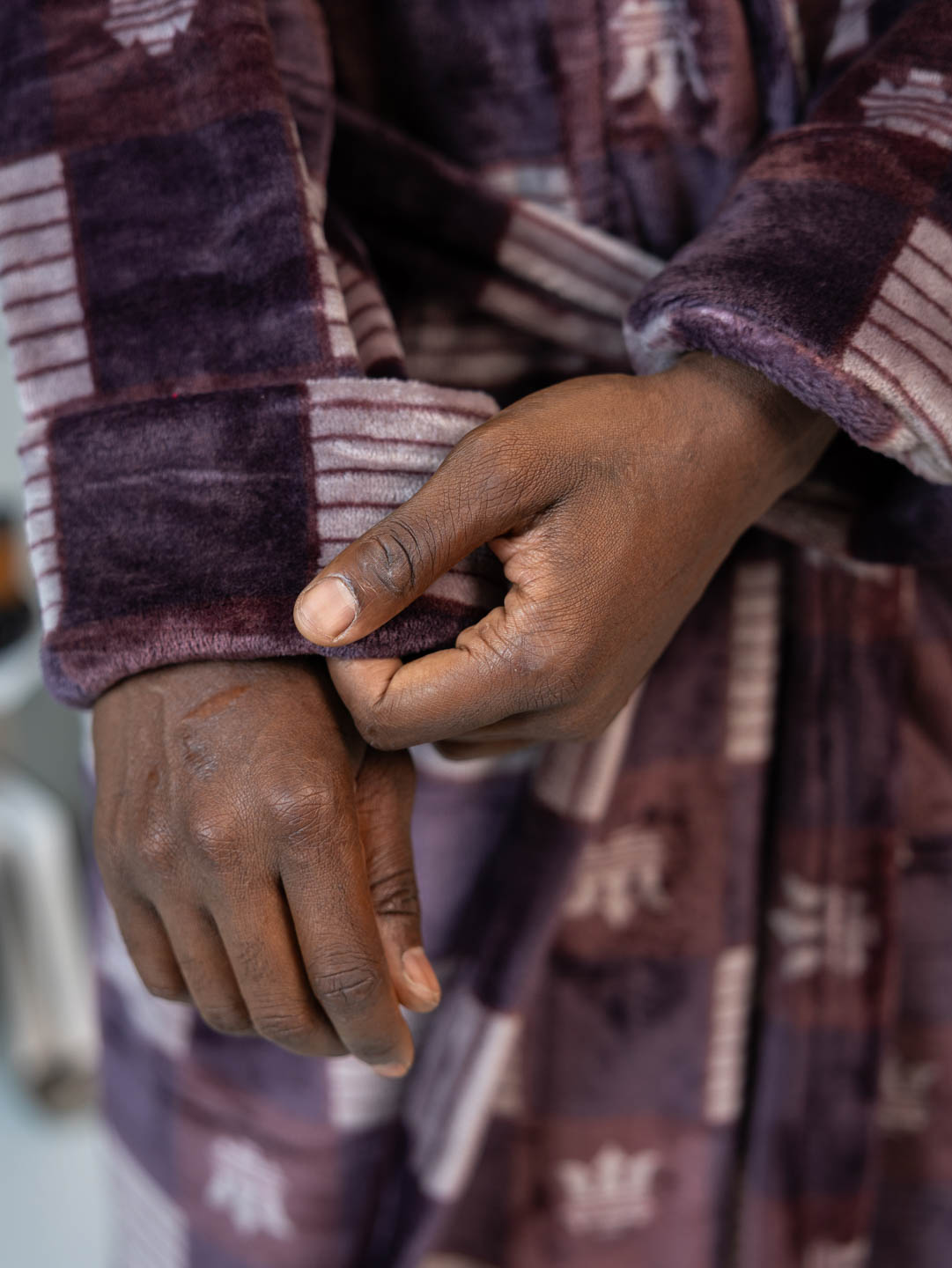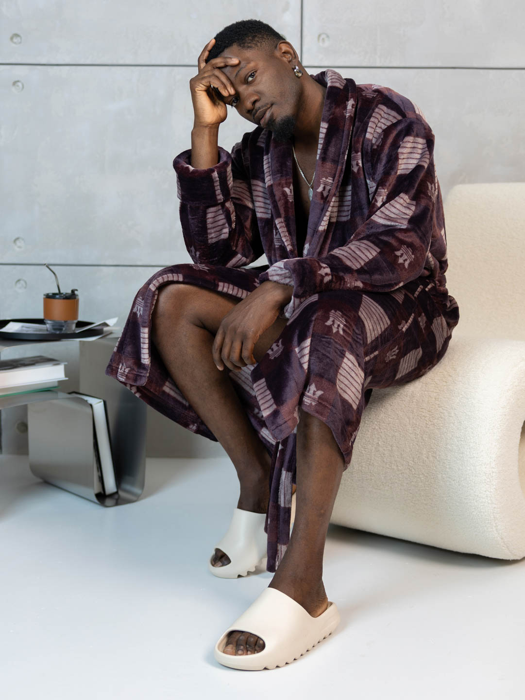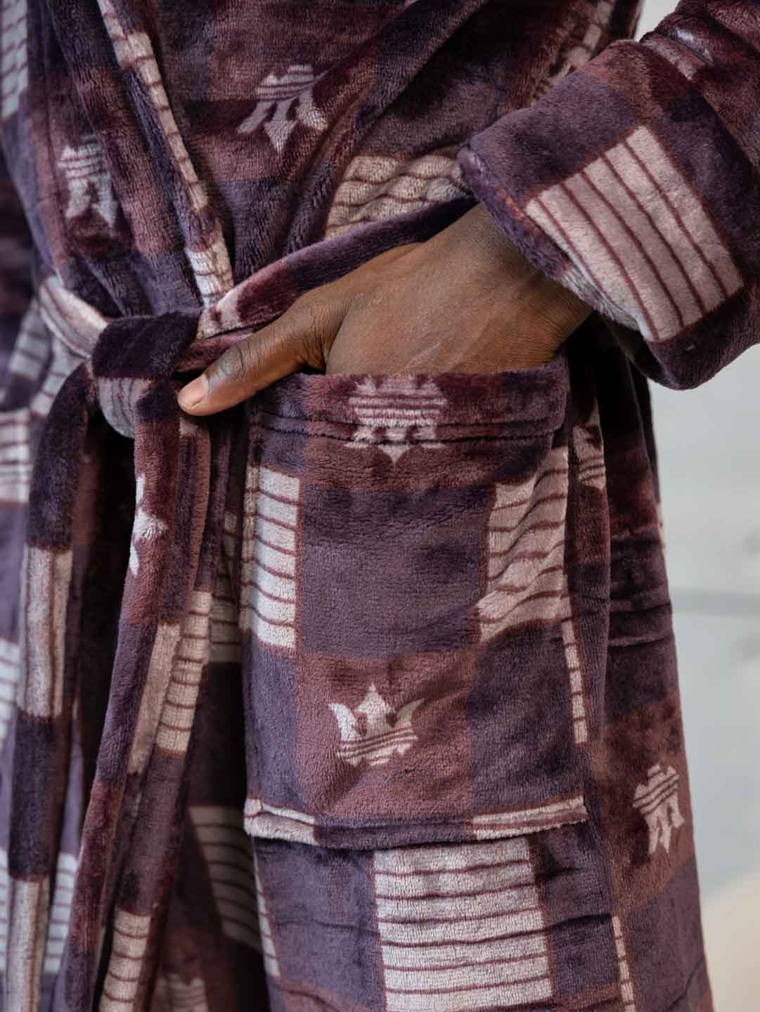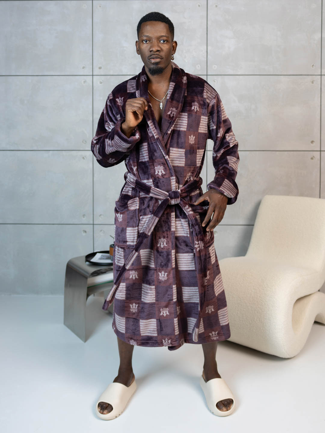 Халат мужской полуприлегающего силуэта из трикотажного полотна «велсофт». Изделие на запах, на поясе. На полочке присутствуют накладные карманы. Вырез горловины V-образный. Рукав втачной длинный.